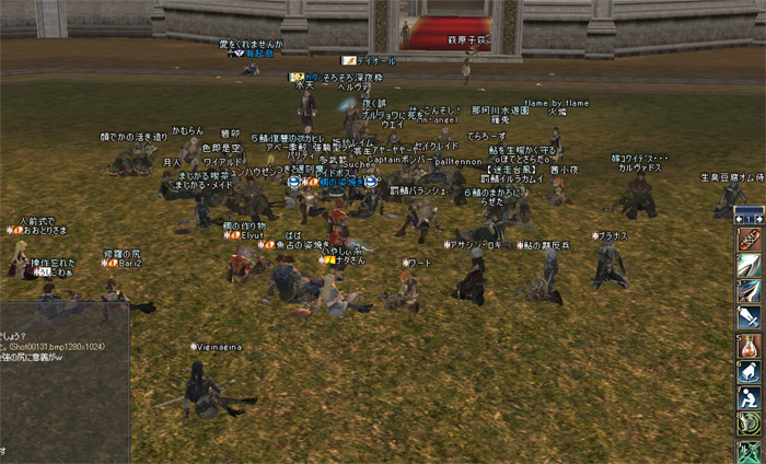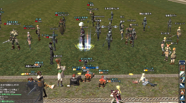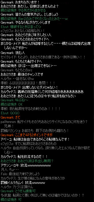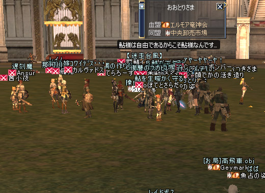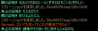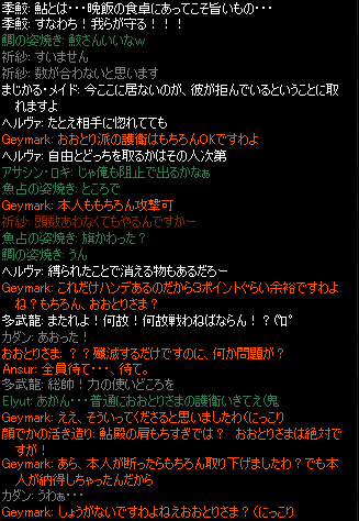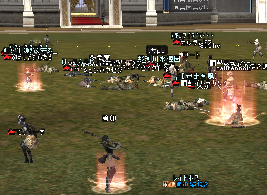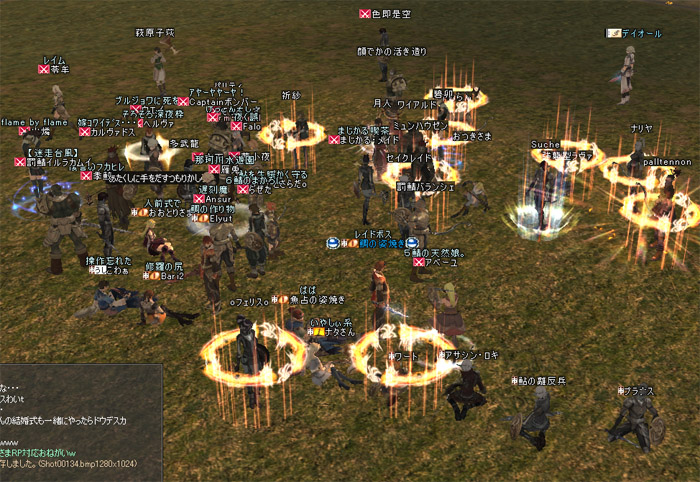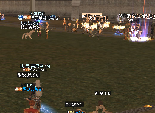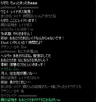 ■WANTED AYU Stage2 イベントレポート■ 【レイド編】 6/24 22:45〜 余興として行われるレイド戦へ こちら、NPC相手ではなく、PC相手のレイド戦となります LV20の団体は、果たして「二人」に打ち勝つことが出来るのか? ![]() レイドボス「鯛の姿焼き」(LV56トレジャーハ ンター)戦、 開始! ……ってまたSSも動画も撮れてないという事故が起こりまして_| ̄|○||| ![]() ひとまず、10秒も持たず鯛の姿焼き討伐成功 D-DAIを一枚ドロップしました さらに、スタッフも想定していなかった出来事 鯛の初恋の人、「アマネ」がお迎えに…… (アマネもまた、夏コミ本にて登場するキャラクターで す 詳細は(以下略)) さてお次!! ![]() レイドボス「Bari2」(LV71グラディエー ター)戦、 開始! こちらは動画があります ほんの一部ですが、お暇な時にでも是非 途中までですが、グラの範囲ビームの脅威がご覧いただけます レイドボス:Bari2戦動 画(18.1Mb) ![]() 40人強で挑んだものの―― 鬼神のごときグラディエーター(尻)の前に敗退! 驚異的な結果を得ました 尚、Bari2のHPは一時1400まで削られたとのこと それでも1400も余ってるんだ……グラ強いっす!! 20分を戦い抜いたBari2に、思わずリアルで拍手を送ってしまいました さあ余興終了、 ![]() このままイベント終了、 エンディングへ――と思いきや!? ![]() 主催者側のこの発言がもとで ![]() ![]() ![]() 鮎派が突発イベントを発生させました 主催者側としては想定外 おおとり派からも反発の声が上がったり しかしながら、何度も言うように 「RP」によって状況を変化させる、という意志は 度が過ぎない限り、またスケジュールが押していない限りは 中央卸売市場同盟としては「有り」と見なす事が多いです 恐らくは、連敗を記した鮎派の中に 強い悔しさと無念さがあったのではないかと思われます 運命を動かしたいという意志を現す―― それはとても大事な事だと思います 私はこれを「進行とルール、企画の都合うんぬん」で片付けたくはありません ![]() おおとりさま(LV71エルダー)を倒すことだけで も かなり難しい状況ではありました しかし、おおとり派メンバーは レイド部下としておおとりさまを守護することを決めます 高速詠唱が可能で、 しかも自己で強力な防御Buffを持っているエルダーに勝つのは どんなメンバーが揃っていようが……難しいでしょう これに打ち勝つ力があるならそれを称えたいという意志で 同盟員より敗者一発逆転の条件を提示 ![]() ![]() レイドボス「おおとりさま」(LV71エルダー) 戦、 開始! ![]() ![]() そして…… 敗者逆転のチャンスはもろく崩れ おおとり派は完全なる勝利を収めたのです ■ 【エンディング編】 へ ■ ■ 一つ前へ戻る ■ |