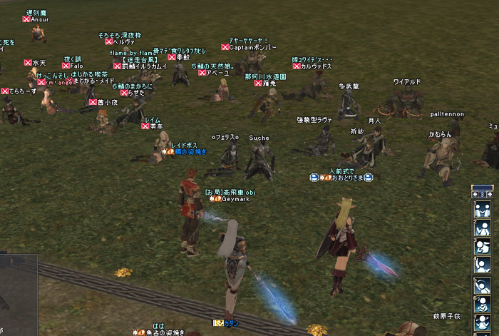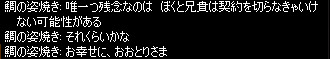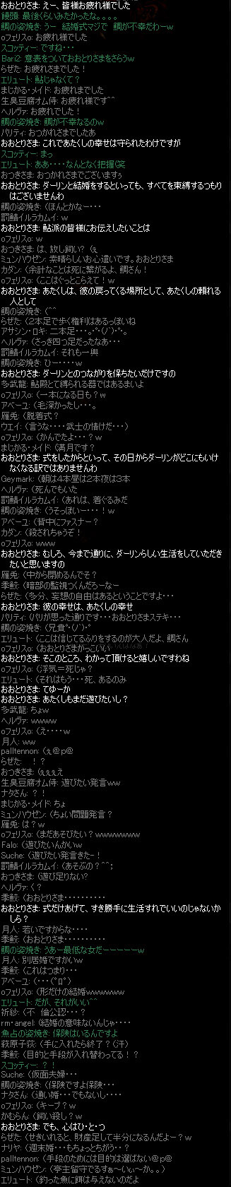 ■WANTED AYU Stage2 イベントレポート■ 【エンディング編】 6/24 23:30〜 ![]() 皆のPRと闘志によって熱い空気に包まれていた会場も いよいよ熱を冷まし エンディングとなります ![]() おおとりさまはこのように締めくくられました おおとりさまの幸福は、約束されたも同然 これからは……どのような生活を送るのでしょうか おおとりさまが言うように大して変わらないのか、それとも? そして 歩み寄りなく、権力と組織をもって全力で手に入れた幸せの裏には…… ![]() おおとりさまとおおとり財閥の工作に一番翻弄されていた鯛 鮎の姿焼きと交わしていた「ガーディアン」の契約は陰り、 鯛の姿焼きは、己が抱える血の運命とともに迷走します (この話に興味のある方は、夏(以下略)) そして鮎の今の意志とは…… おおとり財閥に連行された鮎の姿焼きは、 一つの決意をし、隠された本性と本音を現にしていくことになります ということで!! 細かいルールがちゃんと伝達しきられていなかったり、 ルール規定が途中でやむなく変更されたりと こちらの進行に多少不備のある部分も……その時々では、大変ご迷惑をおかけしました ともあれ、LV20一次転職可で行われるPvPはなかなか見ごたえがあり、 そしてハラハラドキドキしっぱなし! このGvGルールは、 今後身内でたまに持ち出して遊ぼうという話になっております(笑 おおとり派の皆様、おめでとうございました 鮎派の皆様、残念でしたが、 また次回のイベントでのご参加とご活躍、期待してお待ちしております 楽しいひと時をありがとうございました!! 日付変更により参加することが出来なかった方、 今後行われる予定のイベントにお越しいただければ、幸いにございます (GvG用に作られたLV20のキャラは、今後のイベ ントで再度必要となる可能性が大いにあります) 参加された皆様、そしてスタッフの皆様、お疲れ様でした!! ![]() ■スタッフ■ 企画 Mihira 消耗品販売 プティシー グリスウォルド ラウンドオーク 魚京 実況 カダン 萩原子萩 他中央卸売市場同 盟一同より、感謝を込めて ■ 一つ前へ戻る ■ |